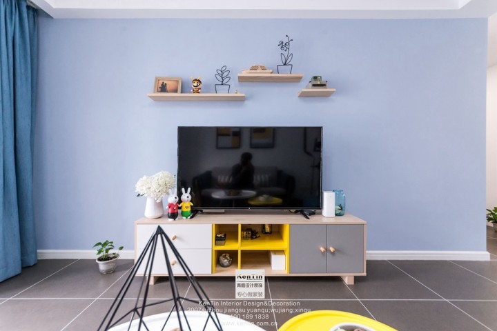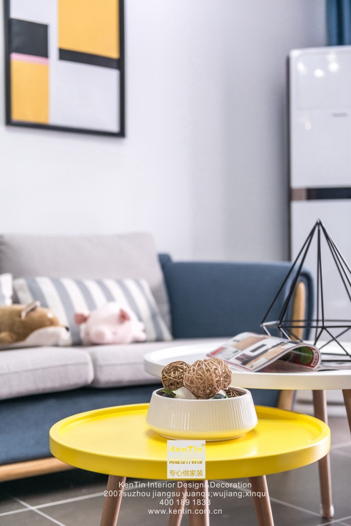 大面積通透的采光讓客廳顯得十分明亮寬敞,客廳的墻面和地面沒有繁復的雕花和紋樣裝飾,只用簡單的直線條和色塊來區(qū)分點綴,整體干凈簡潔。淺色的客廳里,深藍色的窗簾和沙發(fā)相呼應,十分協(xié)調。可愛的玩偶裝飾品、明黃色的小桌幾恰到好處的中和掉放在角落的健身器材帶來的冷酷之感。一邊健身,一邊陪伴家人,日子就是那么簡單而溫馨。
