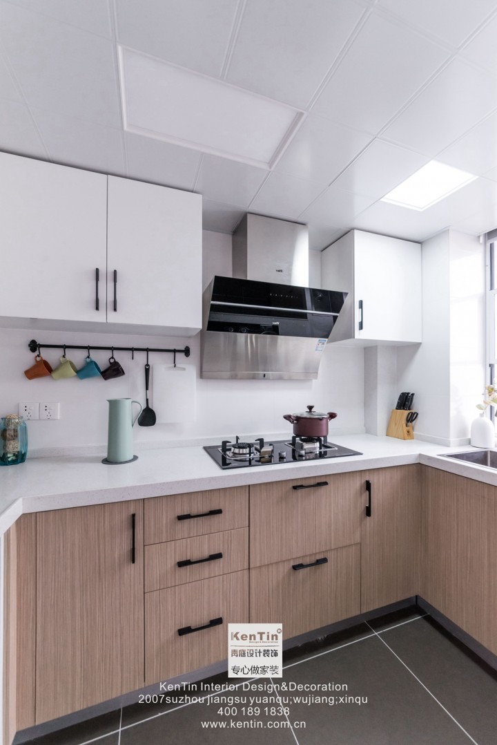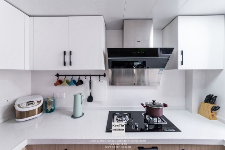 淺色調和木色相搭配,輕松的創(chuàng)造出舒適的居住氛圍。北歐風注重光的運用設計,廚房里開設窗戶和天窗,窗明幾凈。鍋具、刀具被整齊的擺放好,一切都十分美好。多彩的杯具掛在墻面上,在白色的空間里增添亮點。