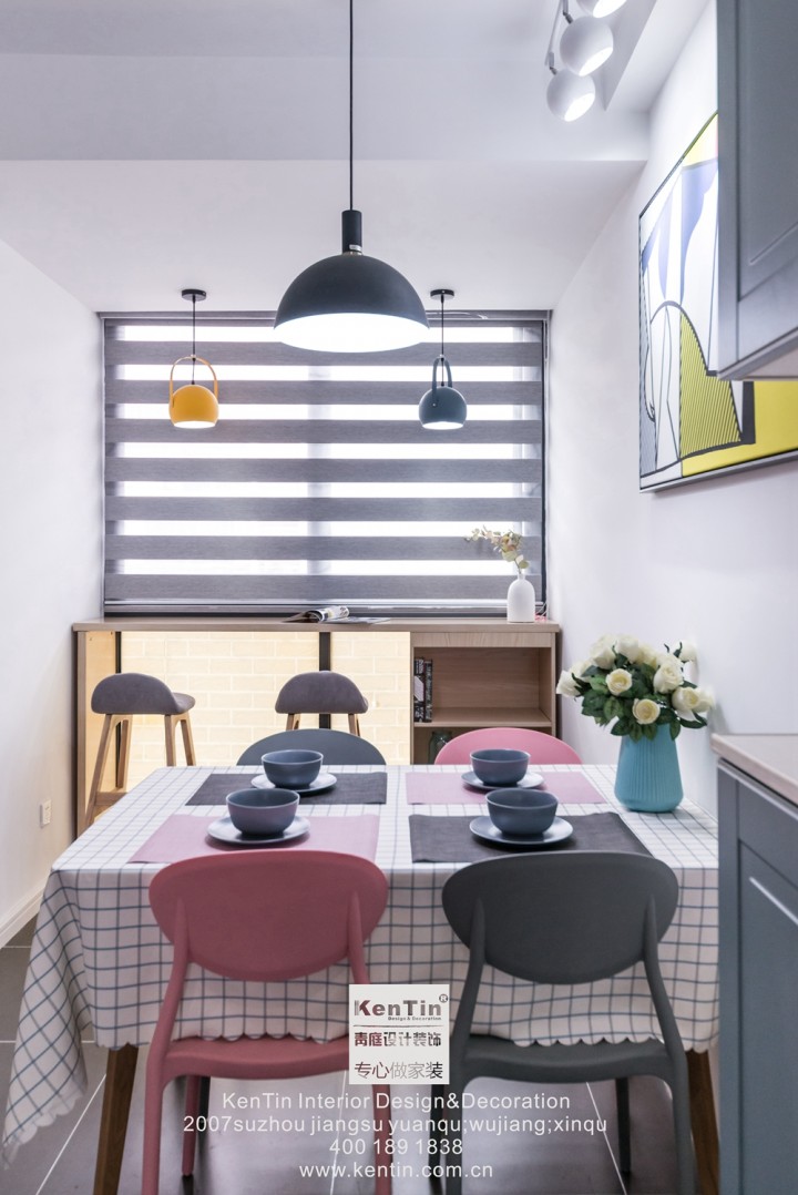 客餐廳一體,整體空間寬敞透亮,木質的餐桌鋪上白色格子的餐布,溫馨柔和。餐桌上的鮮花、粉色的和灰色的椅子搭配起來,浪漫感十足。餐廳里還開闊了一片天地做吧臺,一本書,一個人,再加上音樂,精致舒適的生活由此開始。