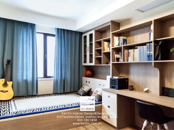 L字形的書柜榻榻米合理的利用空間,原木的書桌書柜簡單內(nèi)斂,隨意擺放的吉他、籃球和抱枕又有幾分的溫馨俏皮。