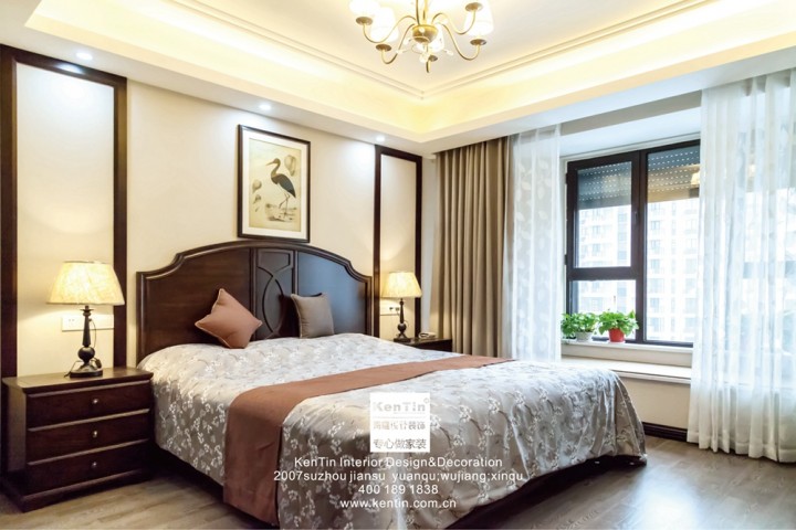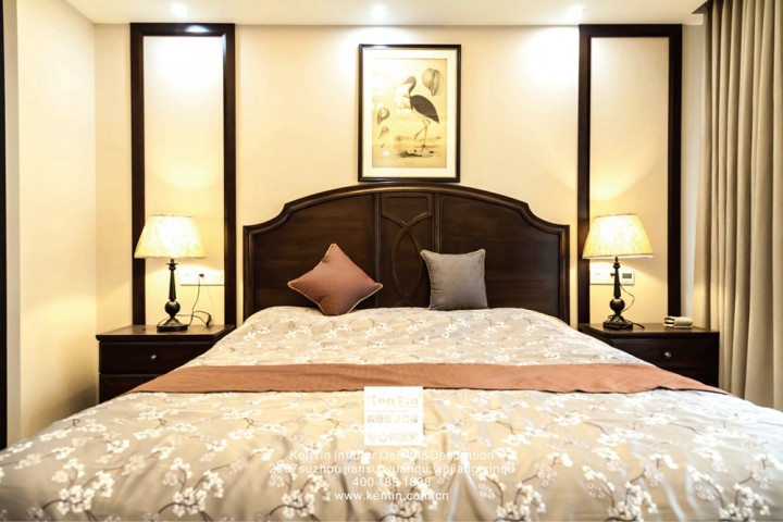 一張床,兩只床頭柜,簡單的空間布局,干凈利落,沒有瑣碎多余的設(shè)計,顯得臥室簡約大氣。淺色系的窗簾與地板、墻壁、床被的顏色相似,深色的床板和床頭柜又拉開了視覺上的高度。暖色的燈光讓臥室溫馨感十足。