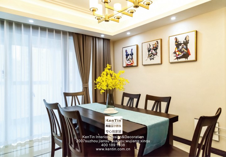 第一眼看見的就是掛在純色墻上的三幅壁畫,灑脫不羈、各有神態(tài)的三只狗狗與追求簡美風(fēng)格的主人一樣的向往自由。黃色的花為厚實的實木餐桌增添了幾分活力,與暖色的吊頂燈光相得益彰。