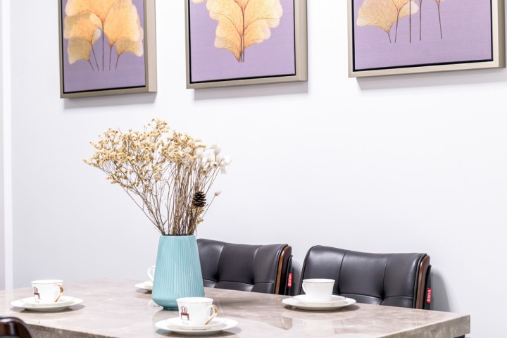 餐廳沿用白色主基調(diào),自然而然與客廳連成一體,不顯突兀。皮質(zhì)餐椅,非常顯質(zhì)感。墻上的掛畫則凸顯出餐廳的功能劃分,設計新穎別致。桌面擺放的花束與掛畫、桌椅相得益彰,使整個餐廳更具觀感,讓人流連忘返。