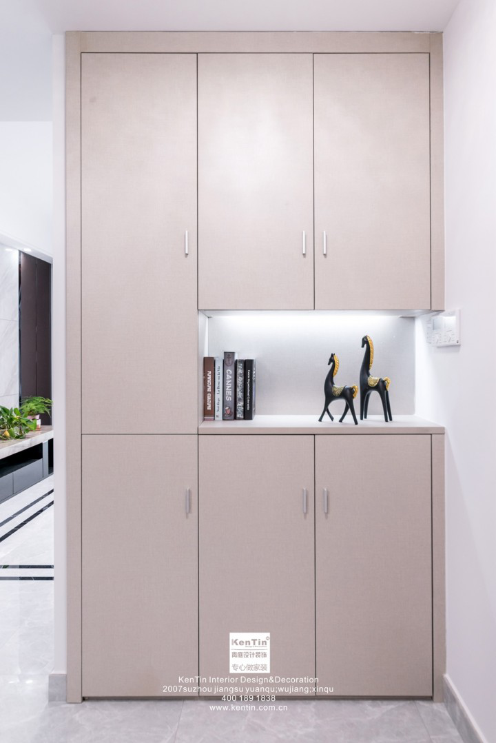玄關(guān)處墻內(nèi)嵌置柜體,增加儲物的同時更節(jié)約空間,擺放的書籍與裝飾品,非常耐看,進門就能看見如此小巧精致的物件,讓人賞心悅目,忘卻在外的煩惱與憂愁。