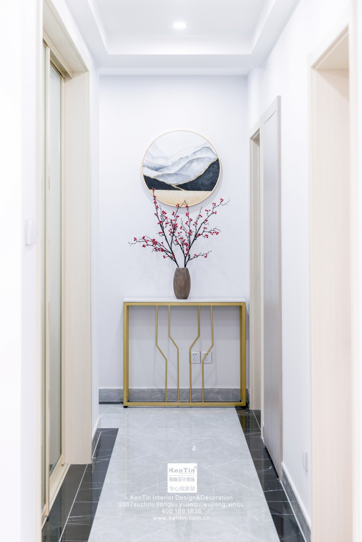 過道也是設計不容忽略的一部分。條案上擺放的仿真花,格調(diào)高雅,不禁讓人駐足欣賞,加之簡易的山水畫,非常有意境,濃濃的中國風氣息撲面而來。