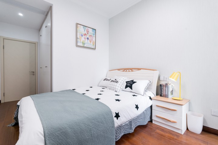 考慮到業(yè)主家父母可能偶爾來住的需求,特意設計了三間臥室。三間臥室各具特色,實木床房古韻古香,大床房穩(wěn)重得體,次臥房俏皮可愛,雖然主人還未入住,但從臥室的設計中已經(jīng)可以完美區(qū)分出每間臥室未來的主人。各式臺燈,滿足了不同場景下的用燈需求,設計精巧,美觀與實用兼具。
