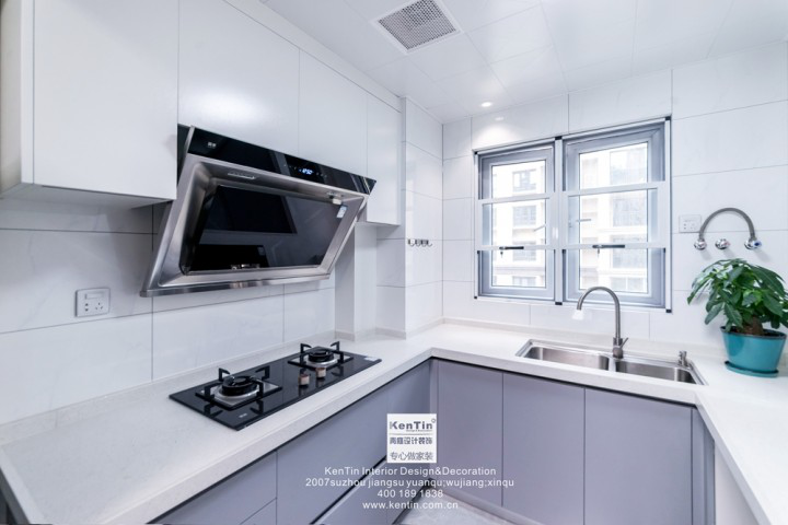 廚房以實用為主,無過多裝飾。上下儲物柜的設計極大地擴充了儲物容量,滿足了業(yè)主對大儲物空間的需求。側(cè)吸式油煙機,方便實用,讓廚房無油煙。整體設計看似簡約但不簡單,線條、區(qū)塊的勾勒,桌面的綠植,無不增添了整體的設計感。