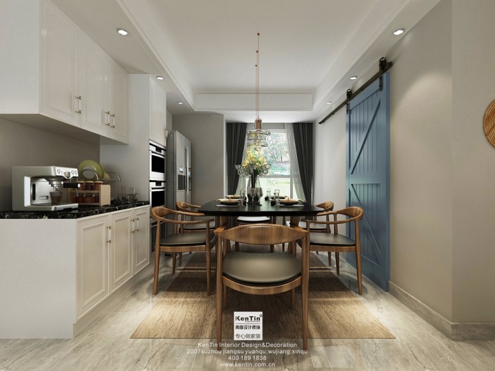 餐廳采用溫柔的顏色打底,更突顯了深木色的餐桌餐椅。左側(cè)用兩層柜子打造了更實(shí)用的操作臺,窗口引進(jìn)的光使整個多功能的餐廳顯得明朗。