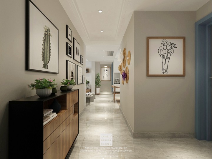 門廳和走廊使用了大量風(fēng)格不一的裝飾畫,使關(guān)注點(diǎn)更集中于中上層,整個空間看起來更具延展性了。