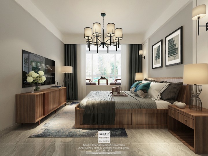 以深色作為家居的主色,搭配灰色的背景墻;顏色對比明顯的燈具使整個臥室看起來獨(dú)具理性美。