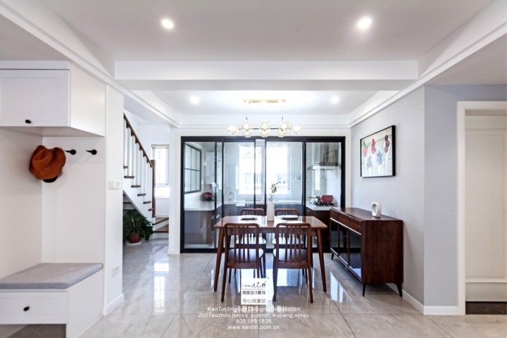 餐廳家具與客廳風(fēng)格一致,燈具的選擇也遵從了空間統(tǒng)一性原理。廚房空間較大,光線明亮,呈U字形分布,下柜區(qū)域具備了一定的存儲(chǔ)空間,上柜相對(duì)來說設(shè)置較少。下班回家,品一桌家常美食,放下一切繁雜事宜,靜靜體會(huì)日常。