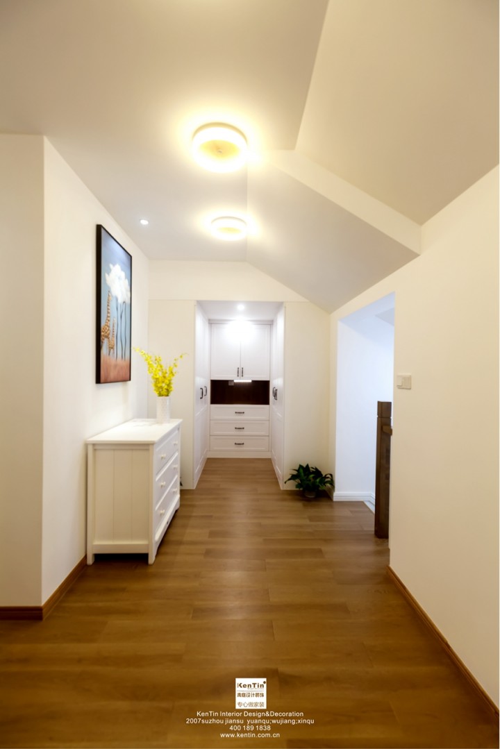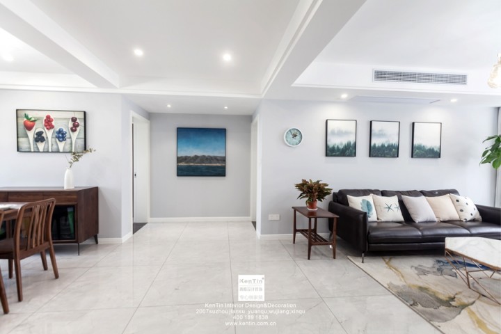 整個(gè)客廳區(qū)域以白色調(diào)為主,800*800的地磚突顯空間感,沙發(fā)背景墻除了三幅水墨畫之外,無任何裝飾物和凹凸面,電視背景墻做了硬包處理,整個(gè)平面簡(jiǎn)單大方無任何繁雜感。