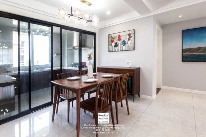廚房整面的玻璃移門使得餐廳區(qū)域非常通透