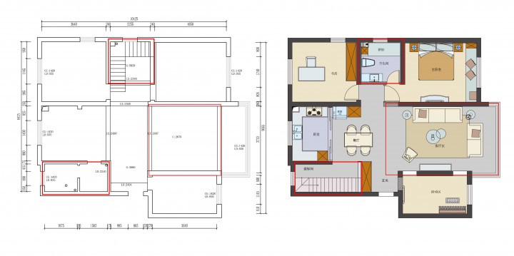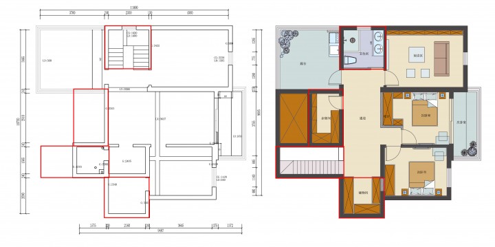 拆除原始戶型的樓梯位置(上圖上邊紅線框處),將空間合理重組