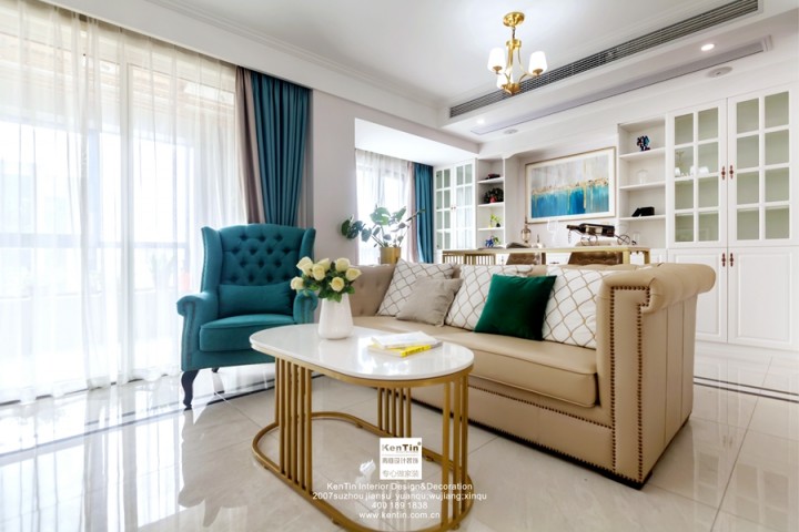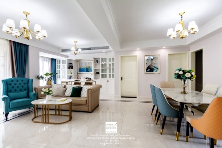 餐客廳之間毫無阻隔,讓空間舒朗,視野所到暢通無阻。整體色調(diào)以明亮的白色為主,點(diǎn)綴的藍(lán)色窗簾和沙發(fā),則仿佛帶著海洋般的清爽與包容。家具的金色金屬部分,則不露痕跡地將奢華融入其中。