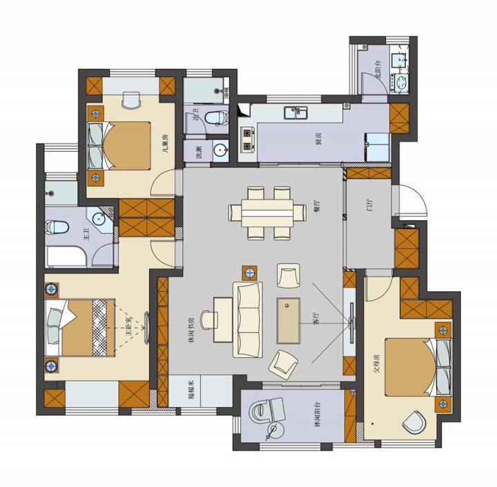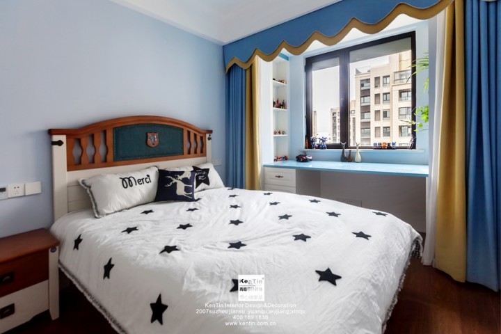業(yè)主是幸福的一家三口,家有小帥哥一枚,設(shè)計(jì)色系里的藍(lán)色,仿佛為他量身打造,房間的色調(diào)由淺藍(lán)向深藍(lán)過度,輔以亮麗活潑的黃色,演繹屬于兒童的陽光明艷。窗簾之外,是屬于孩子自己的英雄王國(guó)。飄窗側(cè)邊被設(shè)計(jì)成了孩子的玩具收納架,將孩子常玩的模型擺放于此,方便取用,也有效利用了空間。