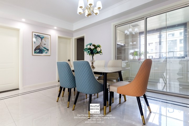 餐桌桌面采用大理石材質(zhì),清爽簡(jiǎn)約并容易清理。桌上的花束也與家具色調(diào)一致,恰如其分,更添溫馨。撞色搭配的餐椅顏色亮麗卻不跳脫,為沉穩(wěn)的空間增添活力。