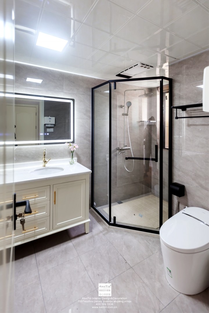 主衛(wèi)設(shè)在主臥內(nèi),鐵藝置物架和門框,是簡(jiǎn)歐風(fēng)格的經(jīng)典代表。幾何線條簡(jiǎn)潔流暢,在滿目的白色空間里格外醒目。