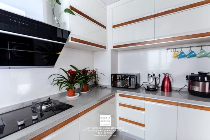 白磚砌成的背景墻與廚房的原木移門(mén)碰撞,清麗自然,將廚房很好的隱藏在墻后。